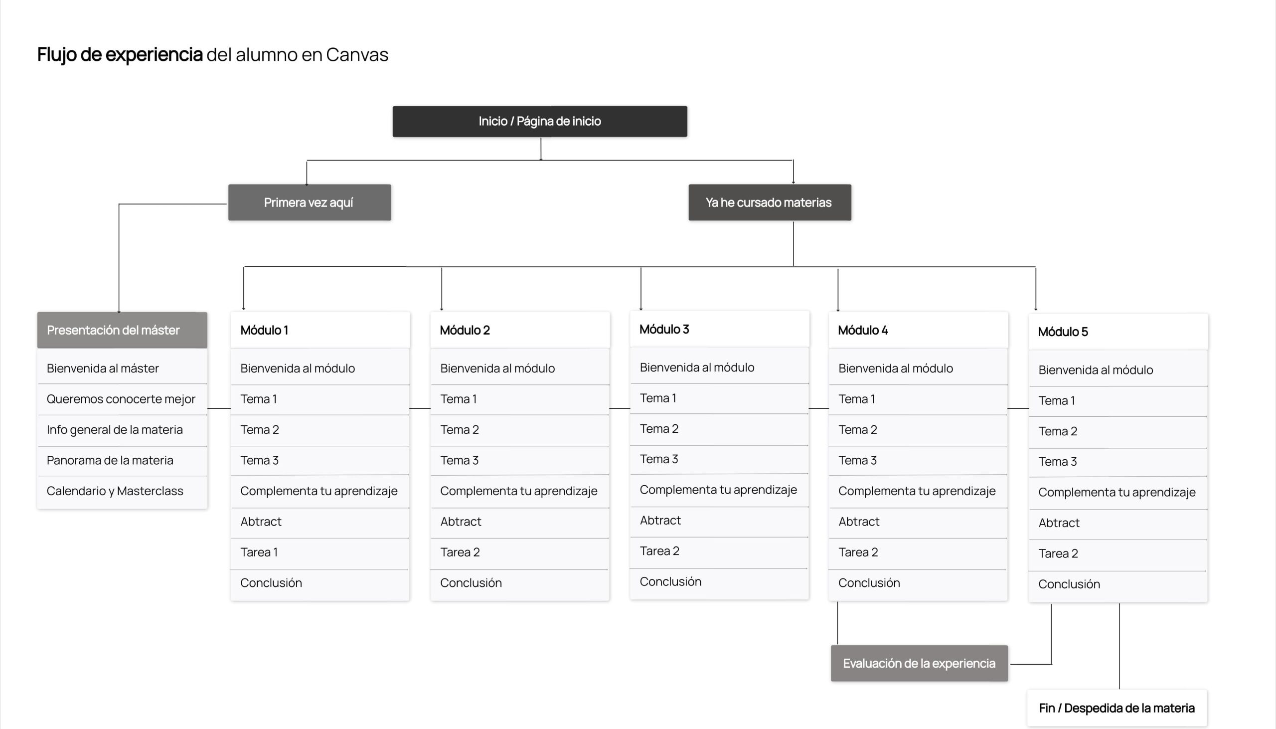Este proyecto consistió en diseñar la experiencia de navegación y la estructura de contenidos para cursos digitales en Canvas LMS, con el objetivo de organizar el recorrido del alumno de forma clara, intuitiva y consistente, facilitando la comprensión de contenidos complejos y mejorando la interacción dentro del entorno de aprendizaje.